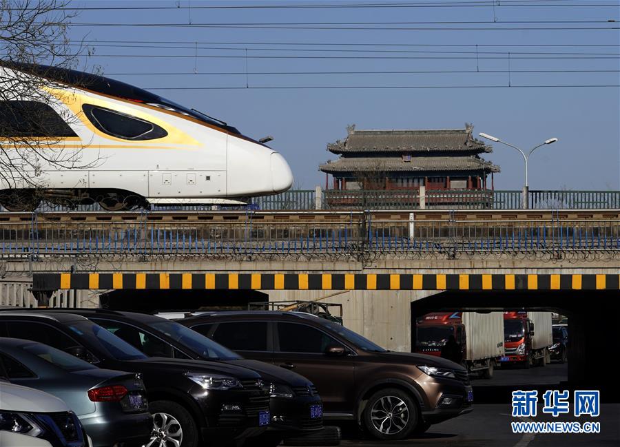 一列复兴号动车组列车在北京永定门城楼附近的京津城际铁路上行驶(1月25日摄)。新华社记者 邢广利 摄