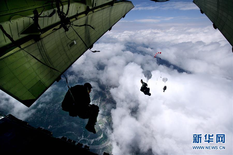 2008年5月14日,15名空降兵从地震灾区四川茂县上空4999米的高空奋不顾身跳下,进入道路阻断的灾区参加救援。新华社发(刘应华 摄)
