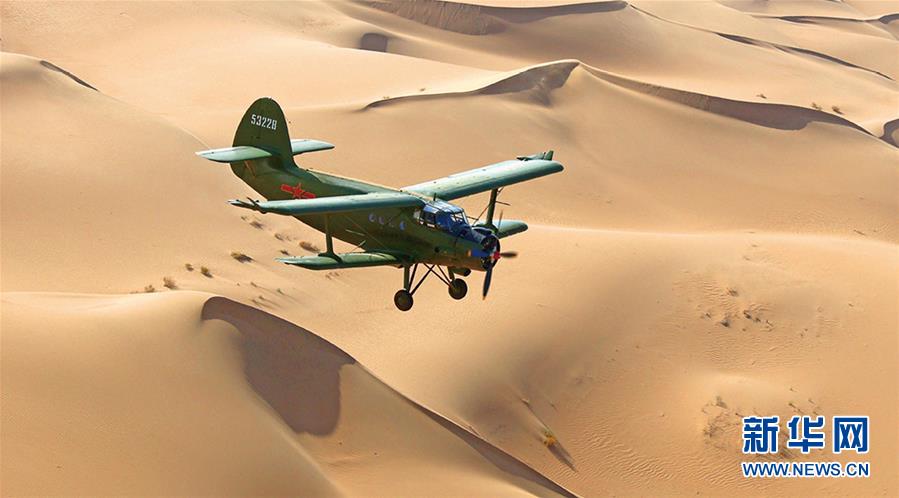2018年,空军运-5飞机在沙漠上空进行飞播造林作业。 新华社发(席博博 摄)