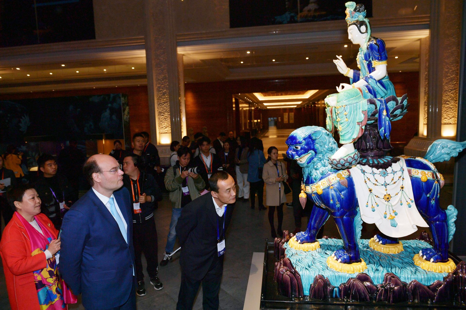 在发布会现场,两尊色彩绚丽、高大挺拔的菩萨造像、珐华彩琉璃器物展现在参观者面前,作品造型大方庄重,色彩浓艳鲜丽,立体雕塑感强烈,而让这些失传了300年的珐华技艺“重见天日”的却是一群年轻的工匠。在这支珐华器制作技艺的团队中,从设计、塑形、烧制、施釉等数十道工序,几乎都是年轻人所为,这些年轻的工匠们都有着一个共同的追求,就是让中国陶瓷史上的这朵“奇葩”重见天日,向世人展示绚烂多彩的中华传统文化。