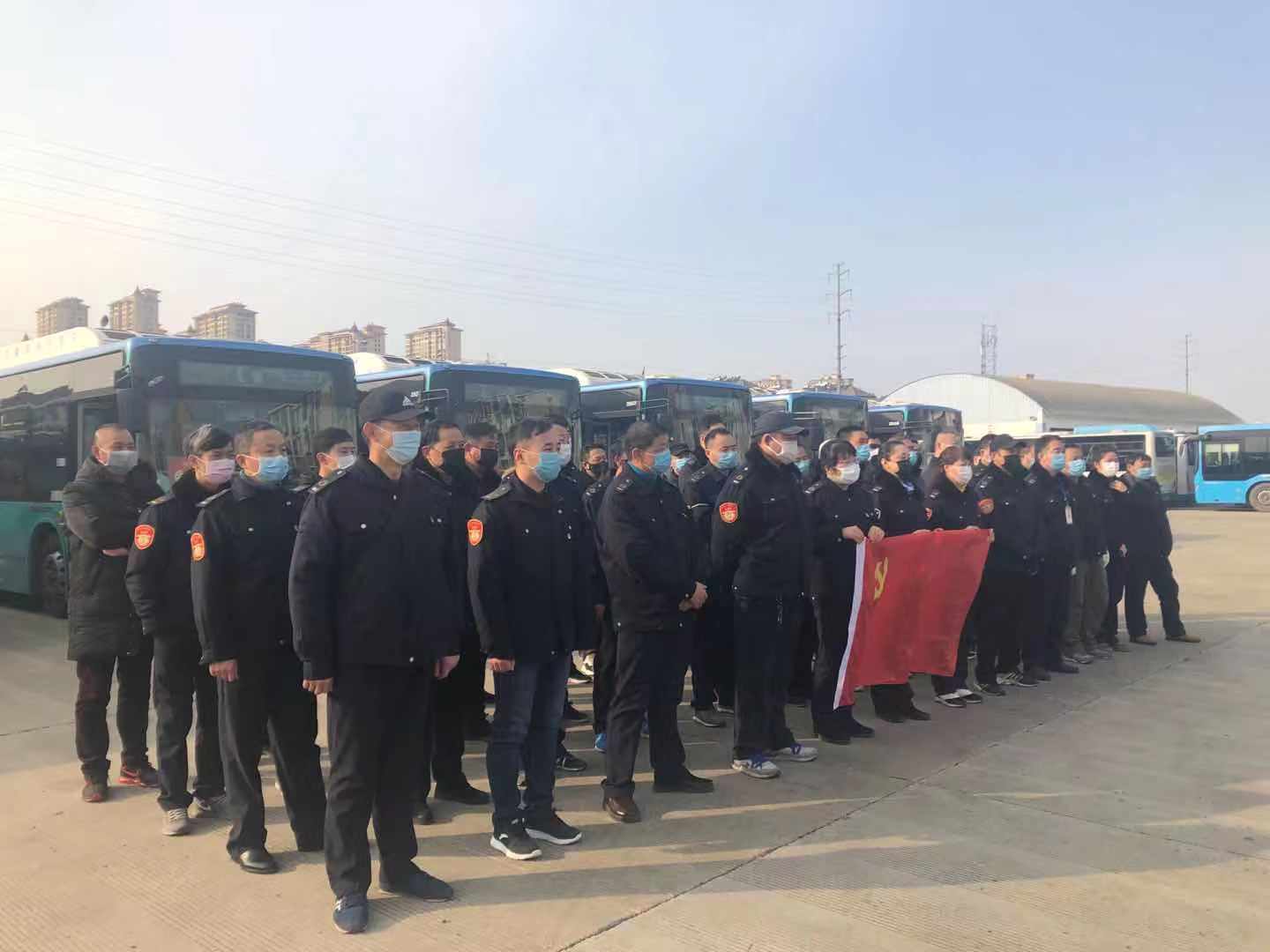 2月1日下午,28名党员公交驾驶员在蚌埠公交集团珍珠小区场站内集结。为了保障全市医护人员出行,交通部门共开通26条定制线路,助力医护人员上下班。据悉,定制线路每日发车117个班次,运送医护人员2000人次。蚌埠日报全媒体记者  李景
