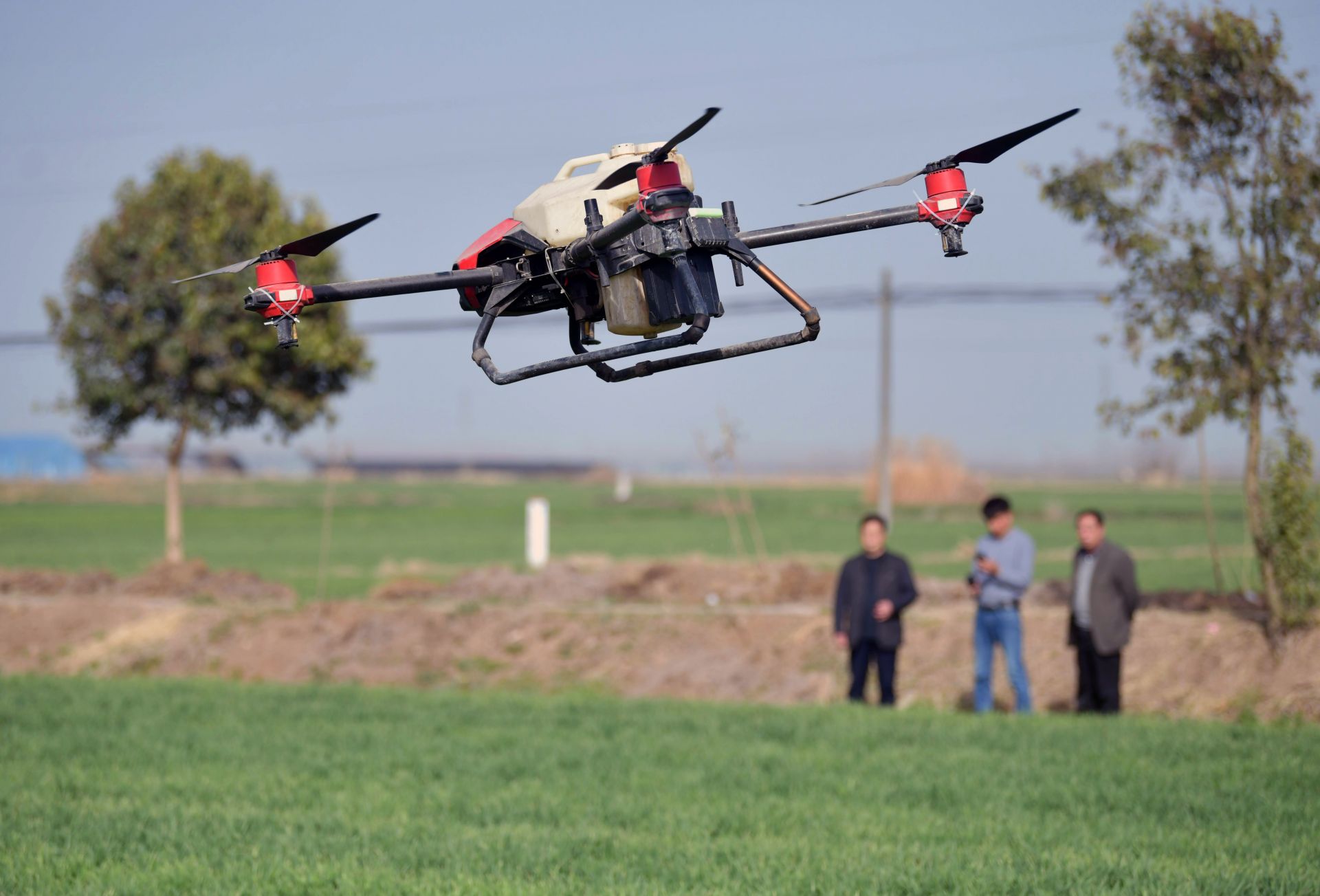 “嗡”地一声,一架无人机升空,4个螺旋桨飞速旋转,小麦叶子随风摇摆。