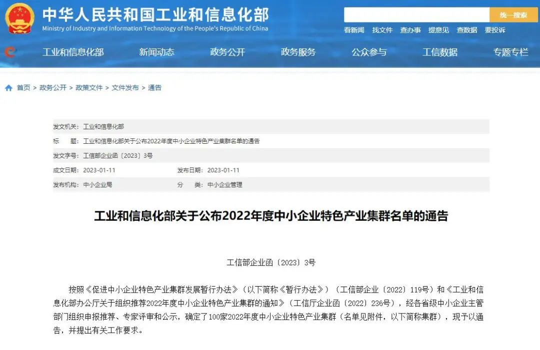 1月11日,工业和信息化部发布2022年度中小企业特色产业集群名单,确定了100家中小企业特色产业集群,禹会区显示模组产业集群入选!