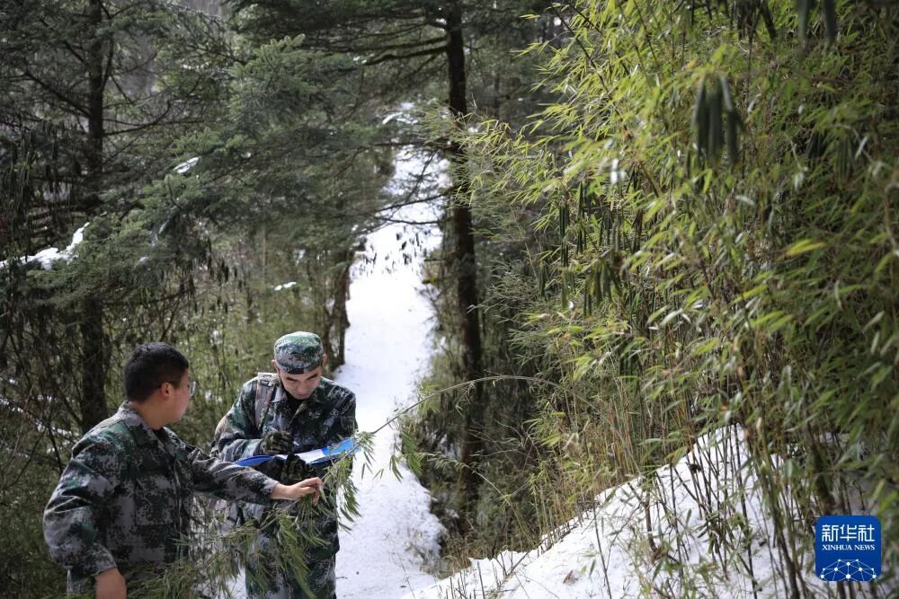 2019年12月13日,甘肃白水江国家级自然保护区的巡护员张雄(右)和许可在观察记录野生大熊猫主要食物之一缺苞箭竹的生长情况。新华社记者 杜哲宇 摄