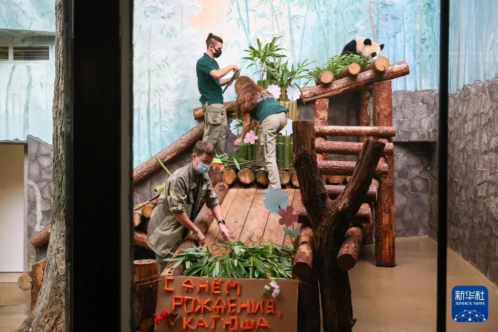 2024年8月24日,在俄罗斯莫斯科动物园,工作人员为大熊猫“喀秋莎”组装“生日蛋糕”。新华社记者 白雪骐 摄
