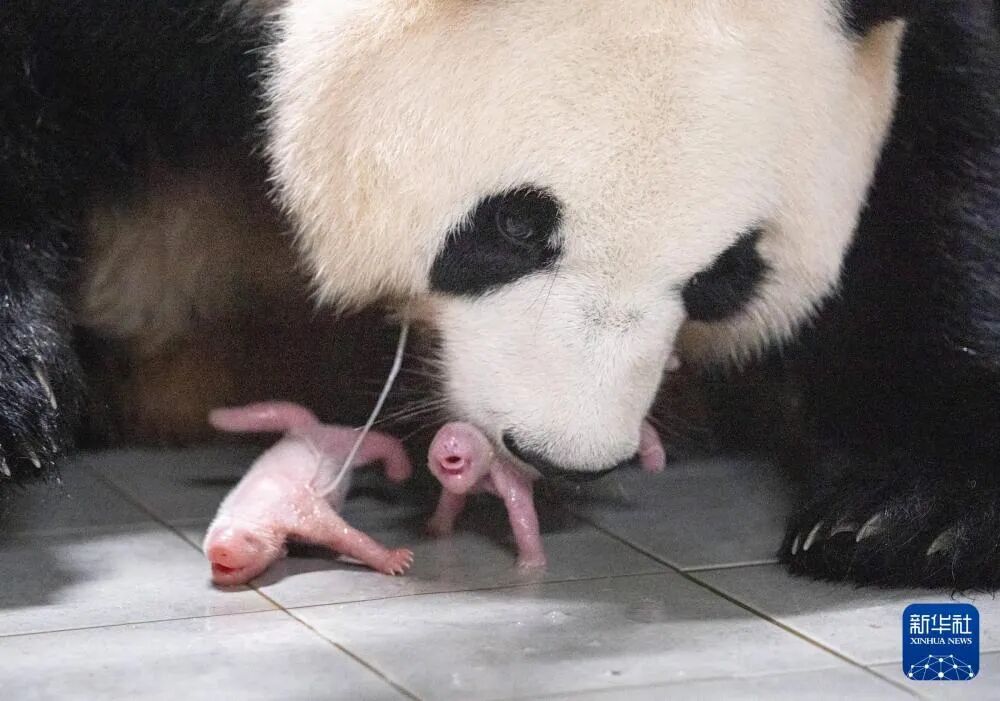 2023年7月7日,在韩国京畿道龙仁市的爱宝乐园里,旅韩大熊猫“爱宝(华妮)”照看刚诞生的大熊猫双胞胎幼崽。新华社发(爱宝乐园供图)