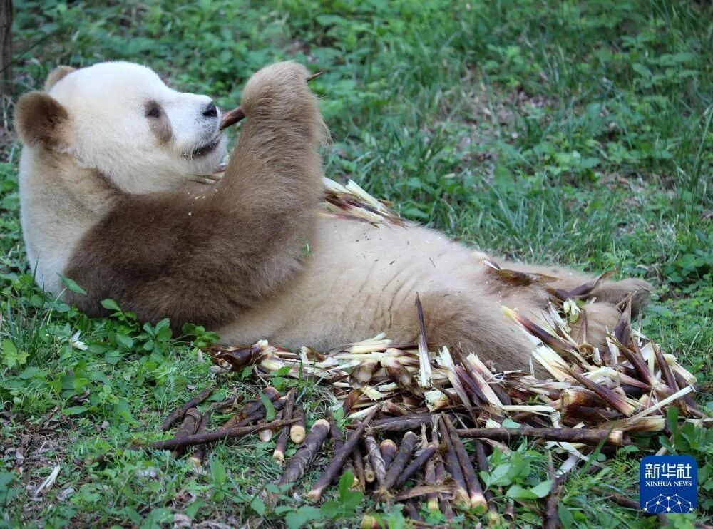 2023年5月29日,在成都大熊猫繁育研究基地都江堰野放繁育研究中心,大熊猫“梅兰”在吃竹笋。新华社记者 胥冰洁 摄