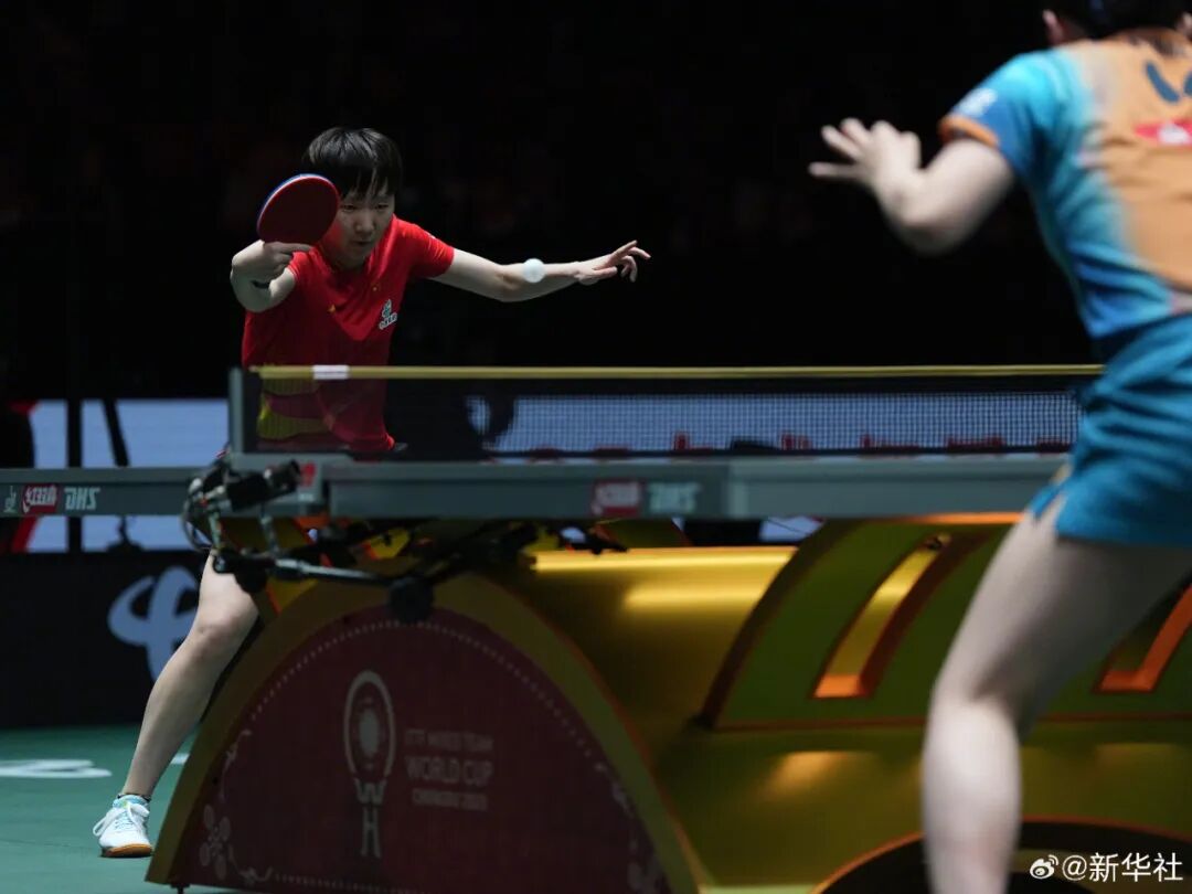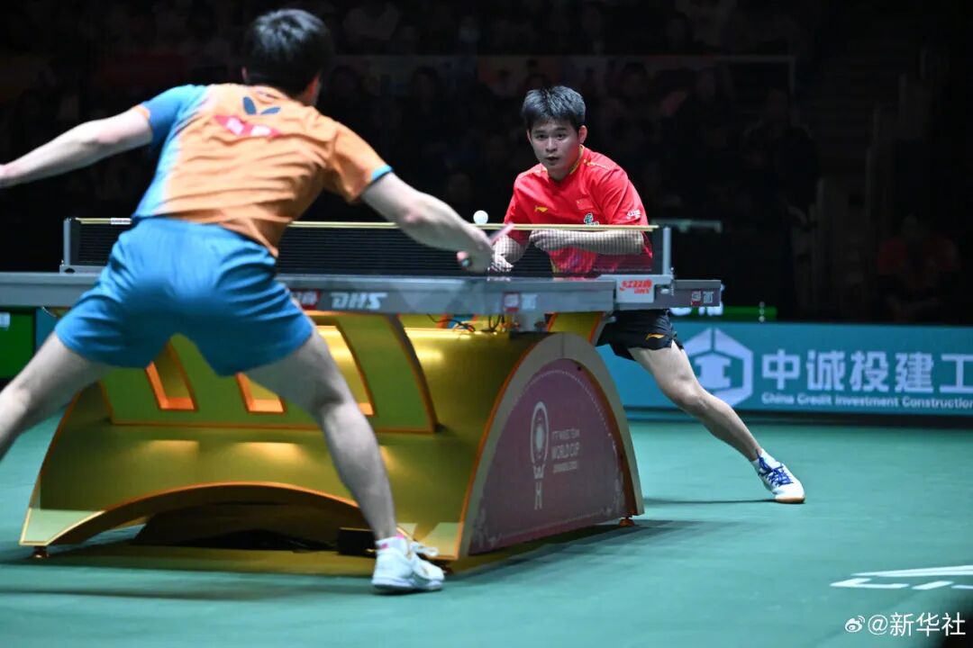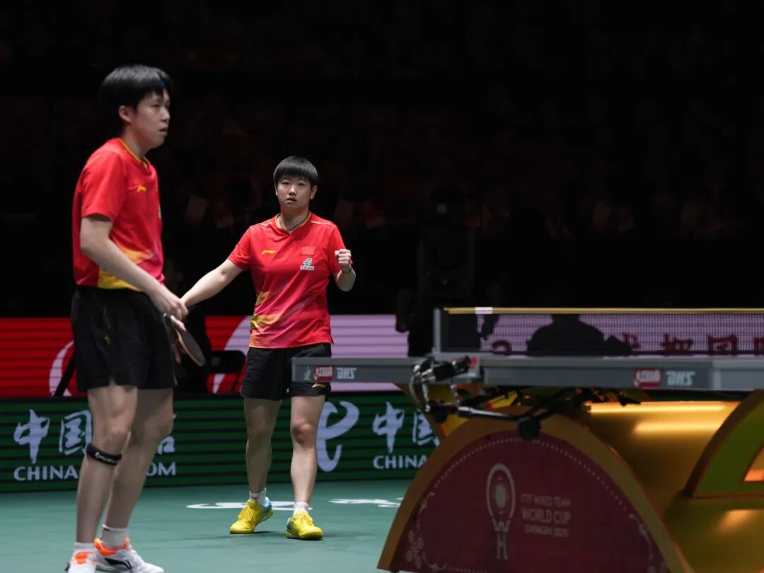 12月7日,中国队组合王楚钦/孙颖莎(右)在混双比赛中。他们3比0战胜日本队组合松岛辉空/大藤沙月。新华社记者 王曦 摄