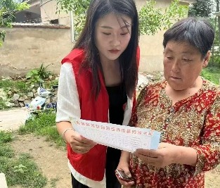 图为淮上区沫河口镇大李村协理员王学娇入户为居民宣传城乡居民养老保险高档次缴费和补缴政策