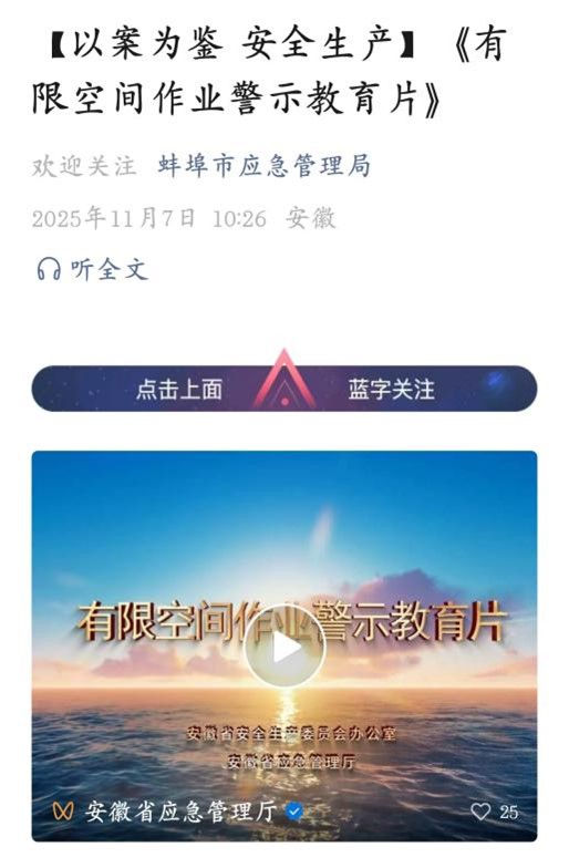 安全提示:有限空间作业必须严格执行“先通风、再检测、后作业”原则,严禁盲目施救!如遇紧急情况,立即拨打119、120求助。