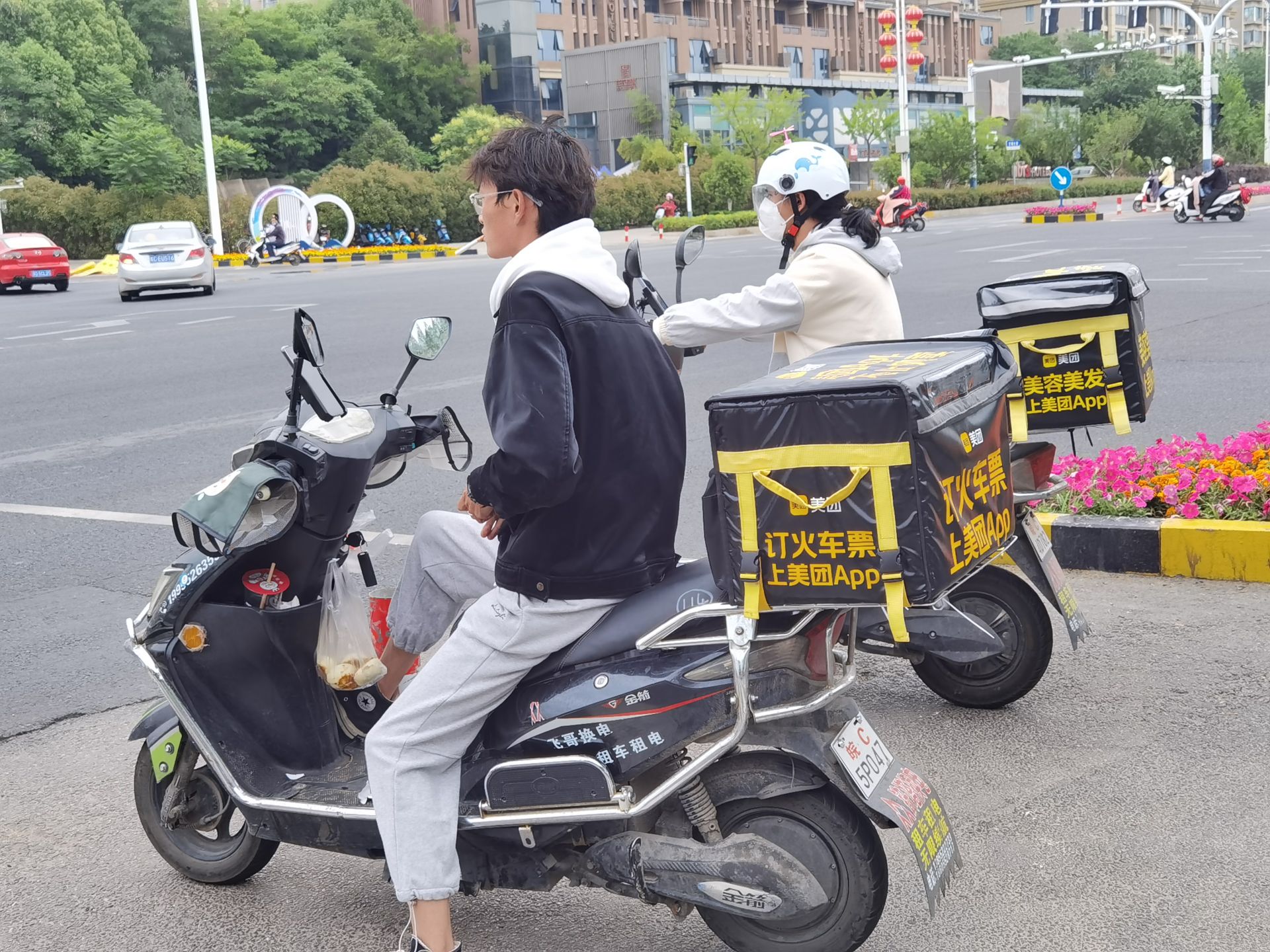 街头等红灯的外卖员。融媒体记者 徐怀明 摄
