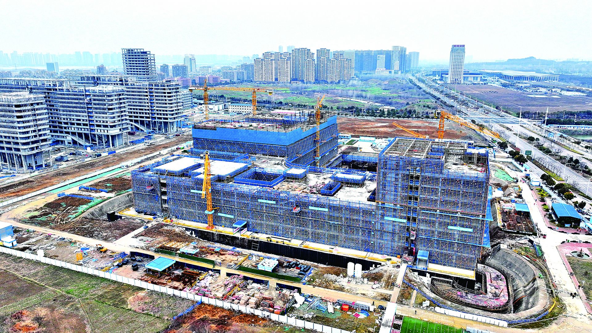 3月7日上午,浙大二院安徽医院项目施工现场,建筑工人按作业要求施工,塔吊等大型机械联合作业。该项目位于龙子湖区,学翰路以西、学苑路以南、规划G21路以东、规划D-7路以北,占地面积约135亩,项目总投资约15亿元,总建筑面积为19.2万平方米。据项目生产副经理周亮介绍,截至目前,浙大二院安徽医院项目科研楼、门诊楼主体结构已经施工完成,正在进行墙体砌筑施工,病房主楼结构施工至主体8层,预计6月份所有单体主体结构施工全部完成。
