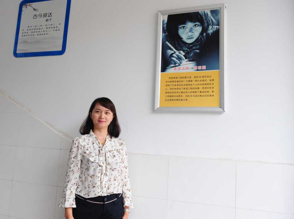 2018年5月29日,在安徽金寨三合实验学校,苏明娟与当年的宣传照片合影。王从启 摄