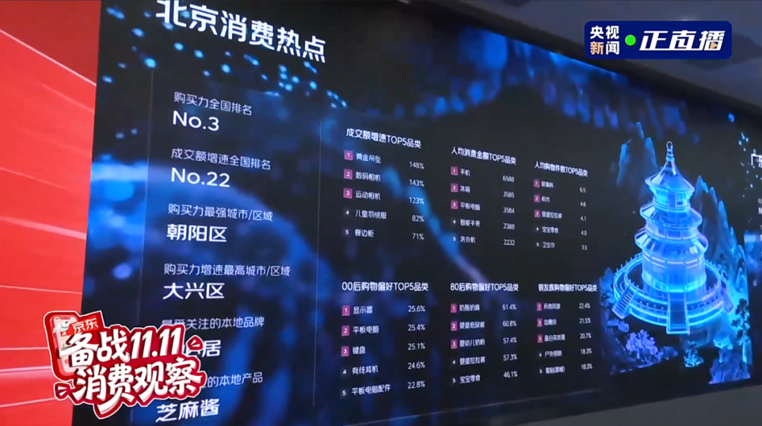 同时,通过屏幕数据,还能了解近段时间不同地区的消费热点以及口味偏好。在北京,芝麻酱成为最受关注的本地产品。从年龄看,00后购买最多的是显示器,老人则更关注药食同源类商品;从人均购物件数看,玻璃杯成为TOP1。