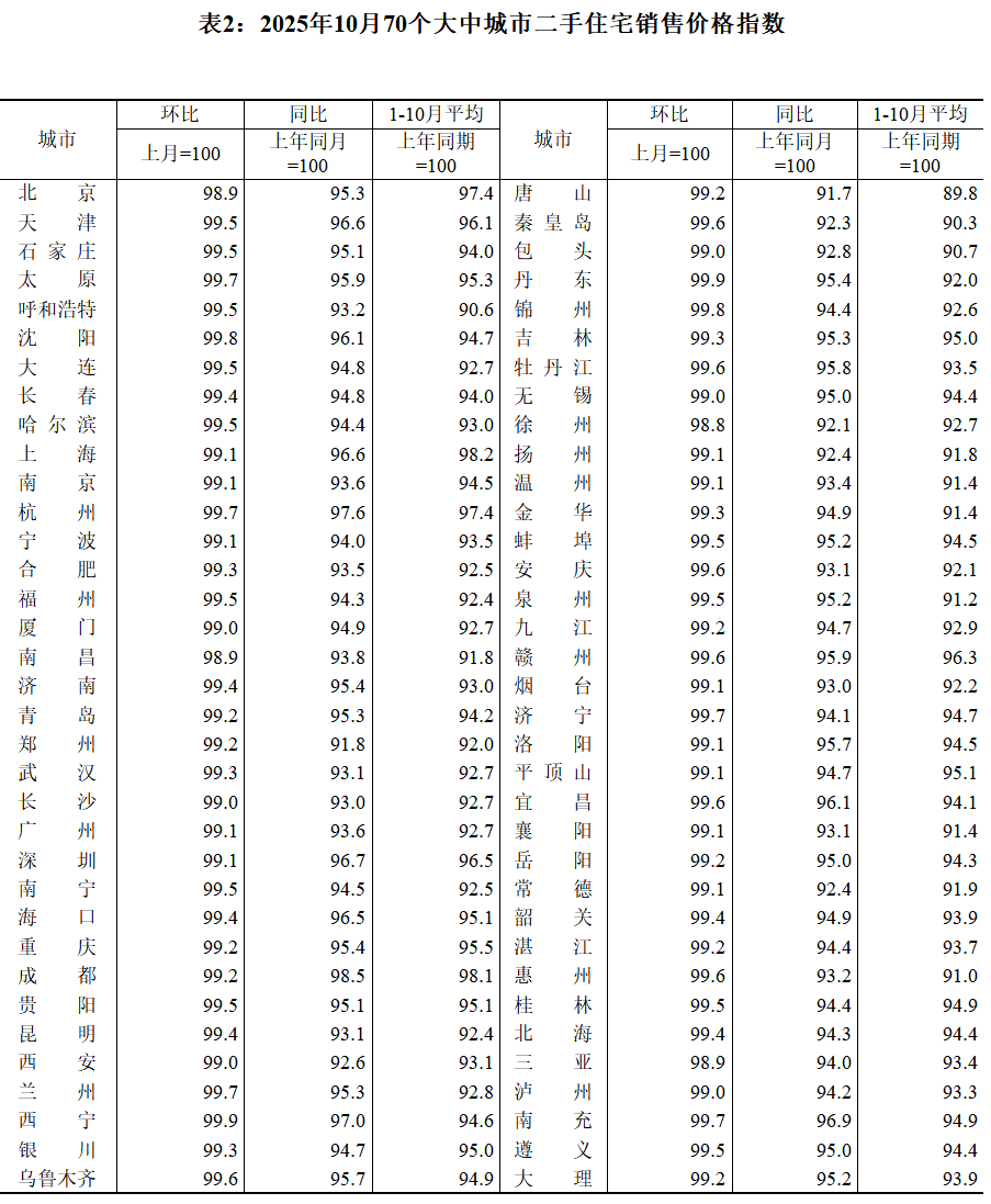 国家统计局11月14日公布数据显示,2025年10月份,70个大中城市中,各线城市商品住宅销售价格环比和同比均下降。