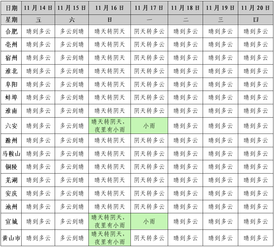 安徽省气象台具体预报显示,16日:全省晴天转阴天,夜间大别山区和江南部分地区有小雨。17日:全省阴天转多云,大别山区部分地区有小雨或雨夹雪;江南部分地区有小雨。