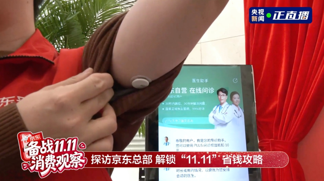 京东健康采销直播间,京东定制版动态血糖仪便捷监测15天血糖数值,接入京医千询健康医疗大模型,消费者可以在京东健康App上在线问诊,得到医生给出的饮食、运动建议。