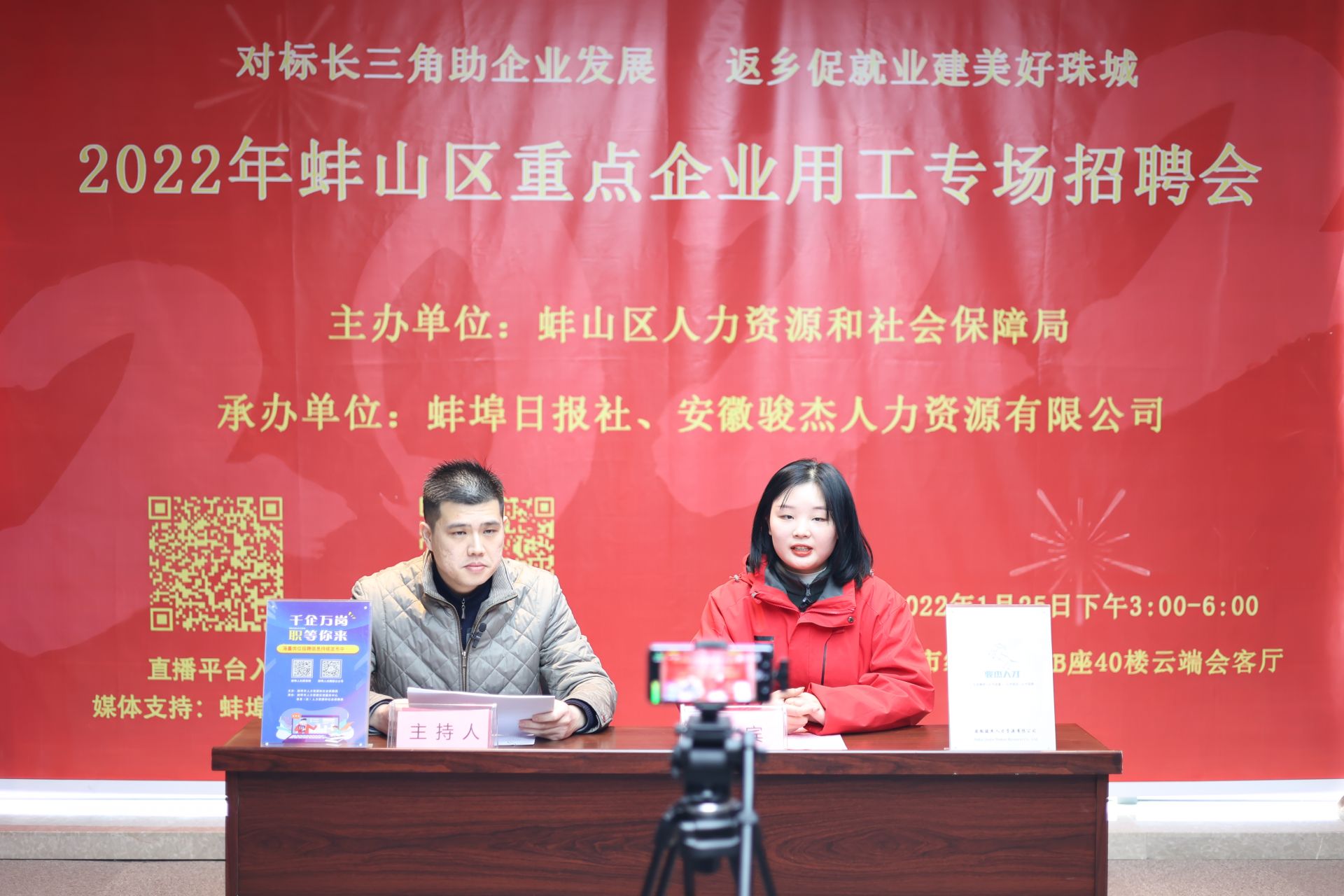 蚌埠新闻网讯 1月25日下午,由蚌山区人力资源和社会保障局主办,蚌埠日报社、安徽骏杰人力资源有限公司承办的蚌山区重点企业用工专场招聘会在绿地珠峰B座40楼云端会客厅如期举办,本次招聘会共有来自辖区内近20家企业参与,招聘会现场全程直播,直播浏览量达到51650人次。
