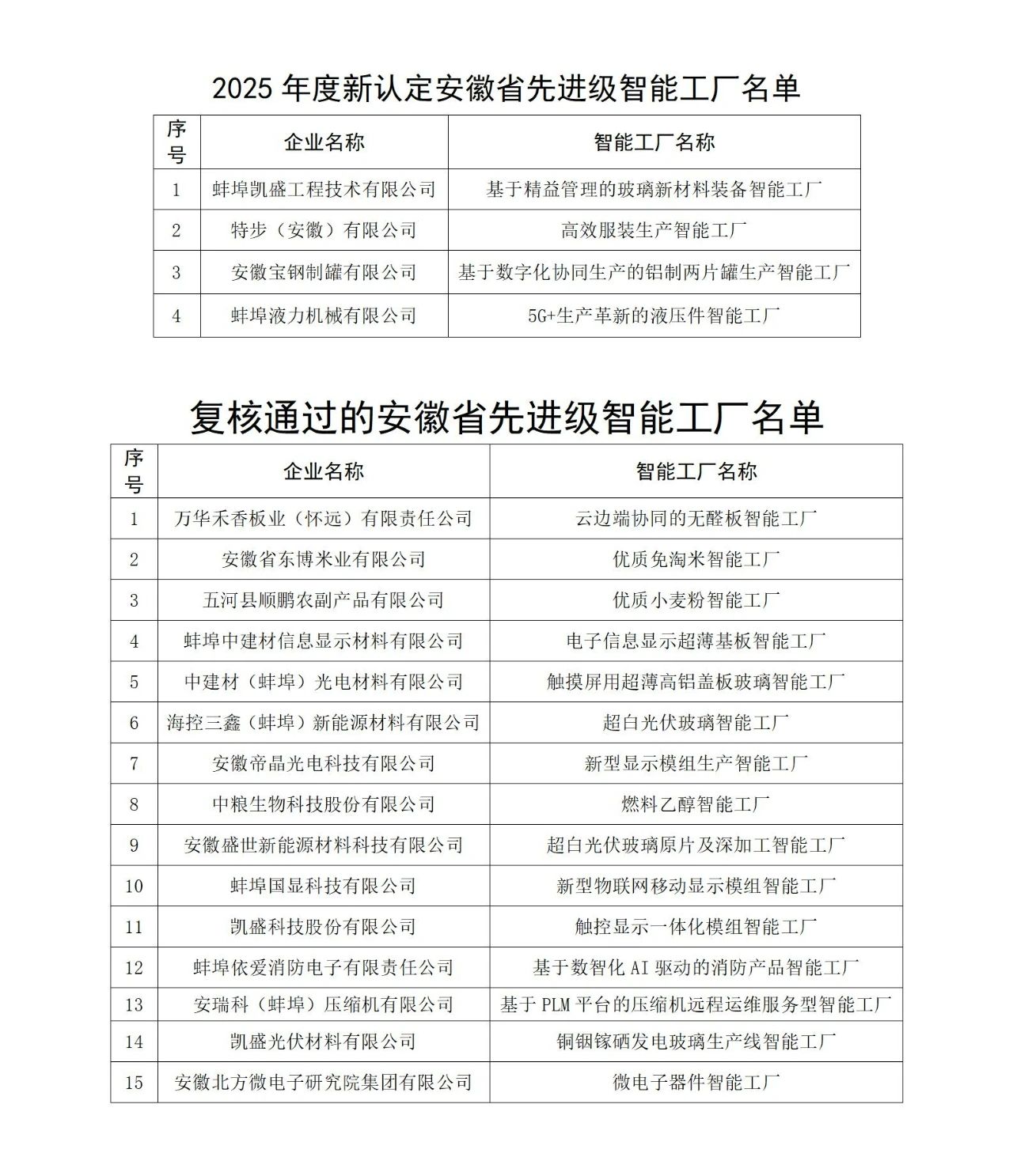 蚌埠发布客户端讯(融媒体记者 顾楷 通讯员 齐扬民)近日,省工信厅公布了2025年度安徽省先进级智能工厂名单,我市凯盛工程、宝钢制罐、特步(安徽)、液力机械等4家企业获评省先进级智能工厂,新认定数量居全省第3位。蚌埠依爱消防电子有限责任公司等15家企业通过省先进级智能工厂复核认定,我市先进级智能工厂总数达19个,涵盖高端装备、新材料、生物化工、新型显示、智能传感、绿色食品、新能源、纺织服装等重点产业领域。