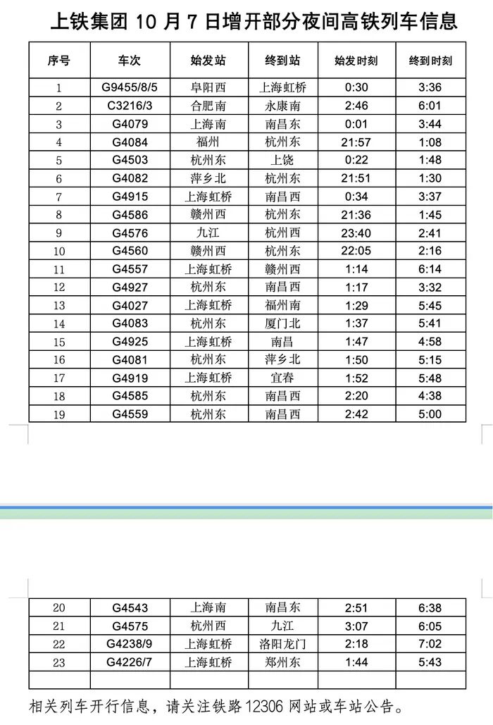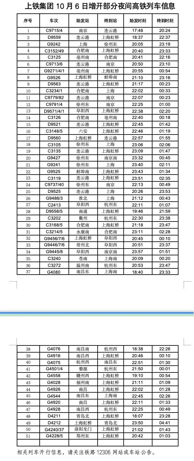 上铁集团在启用高峰运行图的基础上,计划增开155列长三角至南昌、武汉、广州、郑州等方向旅客列车(其中直通旅客列车36列,管内旅客列车119列),组织289列动车组列车重联运行;同时于10月6日、7日计划增开74列夜间高铁列车(其中10月6日增开51列,10月7日增开23列),重点补充阜阳、亳州至上海、合肥,徐州、连云港至上海、南京,合肥、蚌埠至上海,温州、衢州至上海、杭州等管内热门方向,以及南昌、福州、赣州、郑州、青岛往返上海、杭州等直通热门方向的运力,努力满足旅客乘车出行需求。