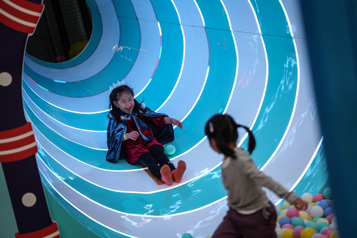 10月8日,小朋友在沈阳粮仓文化产业创意园内的“快乐专+”游乐场体验游乐项目。新华社记者 潘昱龙 摄