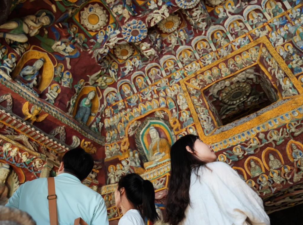 10月9日,在位于今潮8弄的户外展区,参观者游览云冈第12窟“音乐窟”的1:1复制洞窟。新华社记者 刘颖 摄