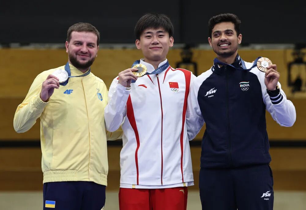 2024年8月1日,冠军中国选手刘宇坤(中)、亚军乌克兰选手库利什(左)和季军印度选手库萨莱在颁奖仪式上。当日,在法国沙托鲁举行的巴黎奥运会射击男子50米步枪三姿决赛中,中国选手刘宇坤夺得冠军。新华社记者 张帆 摄