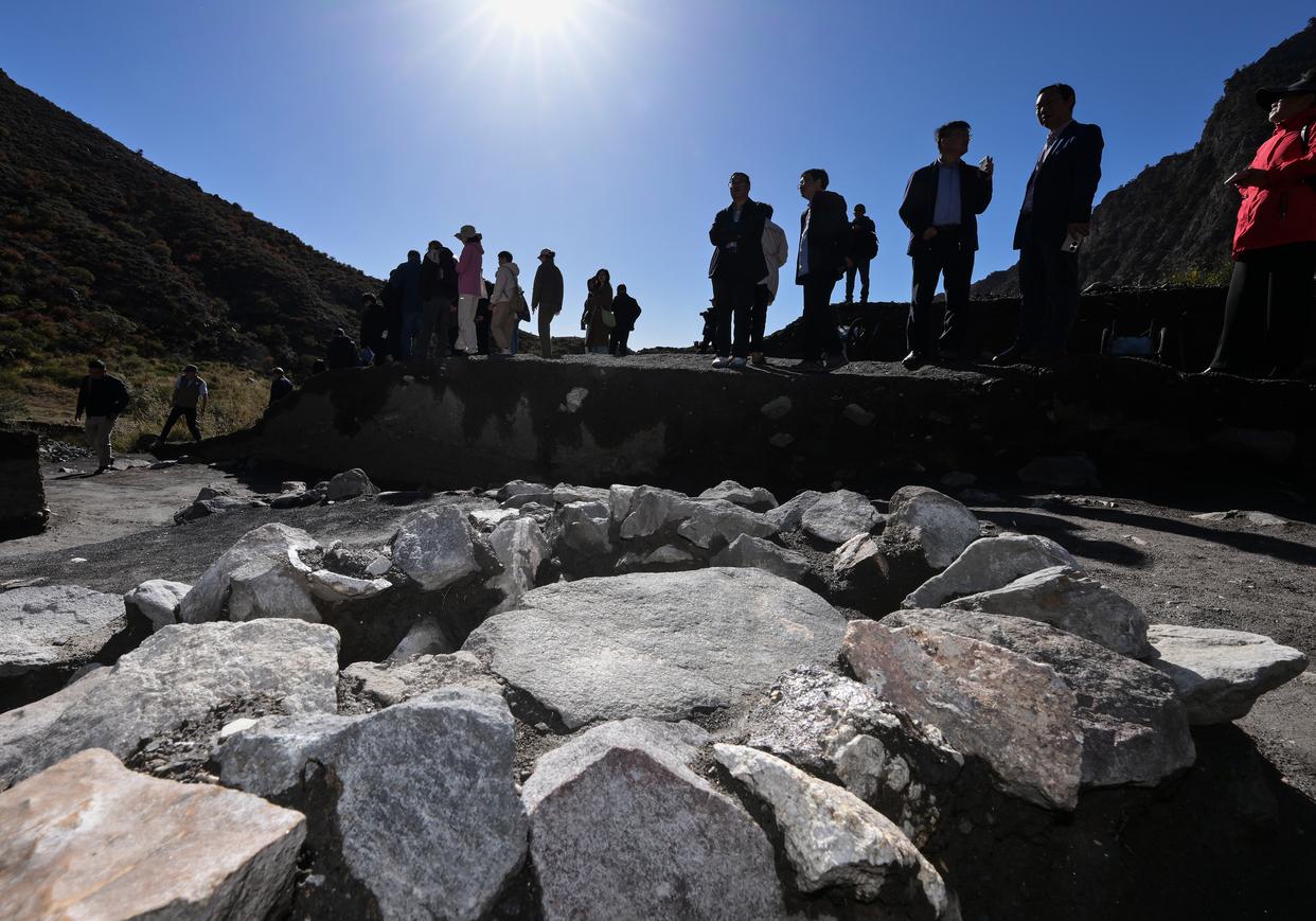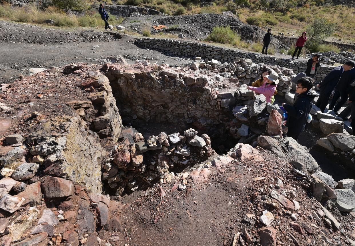 ↑ 考古学家们在对苏峪口瓷窑址2025年度发掘区出土的一处石英加工遗迹进行考察(10月13日摄)。新华社记者 李贺 摄