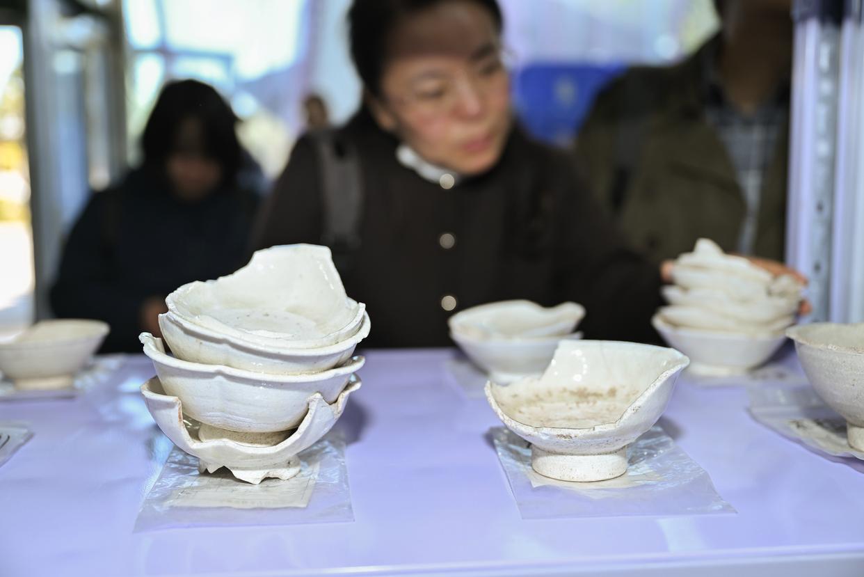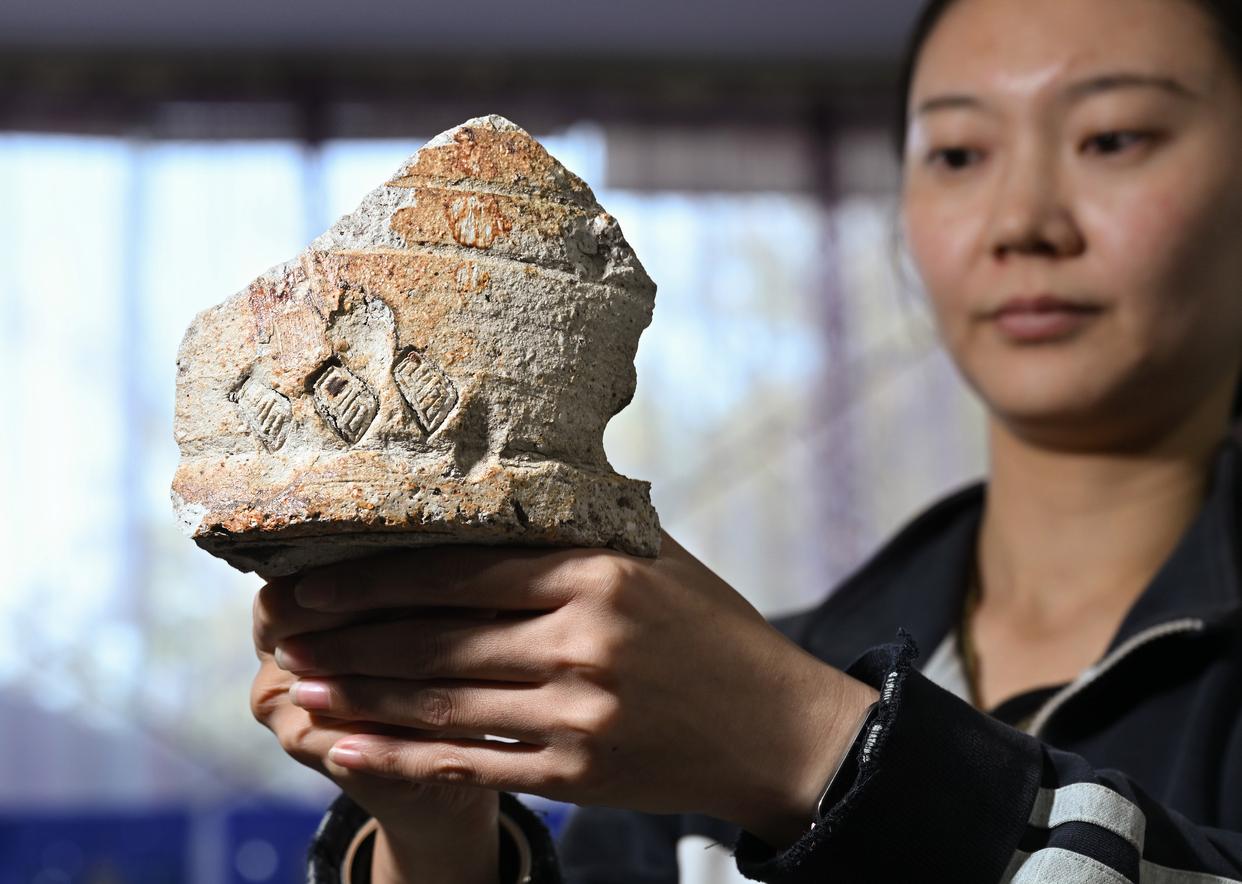 ↑ 一位工作人员在苏峪口瓷窑址考古队文物库房内展示遗址出土的带有“官”字款的匣钵残片(10月13日摄)。新华社记者 李贺 摄