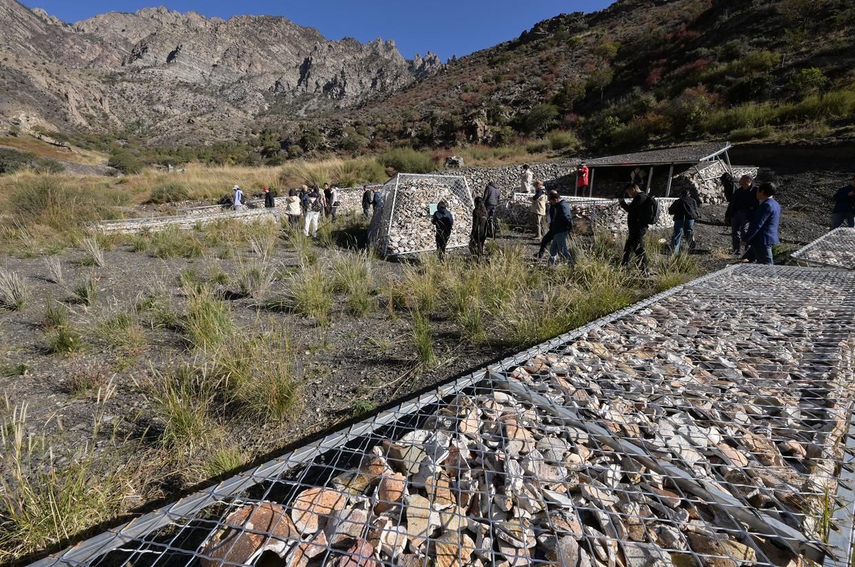 ↑ 为更好保护和展示苏峪口瓷窑遗址,考古队工作人员使用牛毛毡和发掘出土的匣钵残片以及铁丝网将2021-2023年度发掘区遗迹进行了回填保护并原址展示(10月13日摄)。新华社记者 李贺 摄