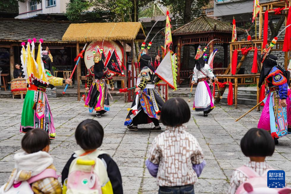 10月24日,孩子们在贵州安顺天龙屯堡古镇观看地戏表演。