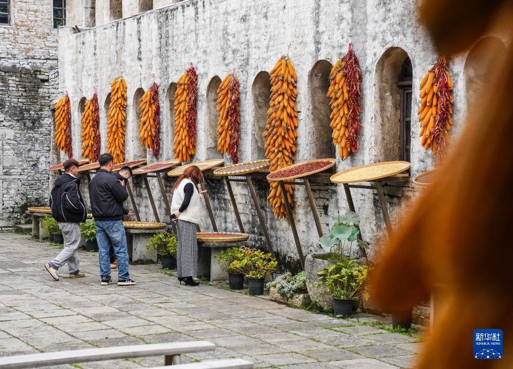 10月24日,人们在贵州安顺天龙屯堡古镇参观晒秋场。