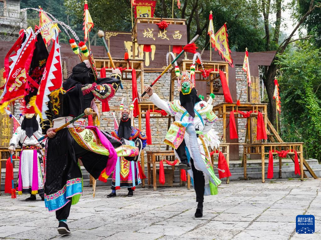 10月24日,地戏艺人在贵州安顺天龙屯堡古镇表演。