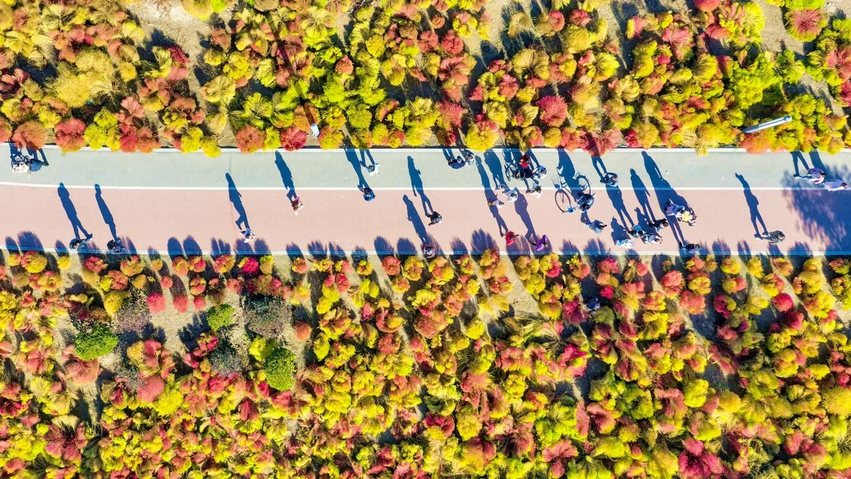 11月2日,游人在天津市滨海新区的白鹭洲公园赏秋游玩(无人机照片)。新华社发(杜鹏辉 摄)