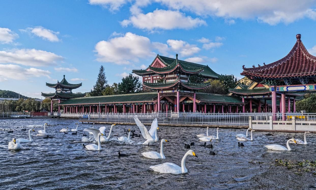 11月2日,在山东省荣成市成山镇西霞口隆霞湖公园,大天鹅在栖息、觅食(无人机照片)。新华社发(李信君 摄)