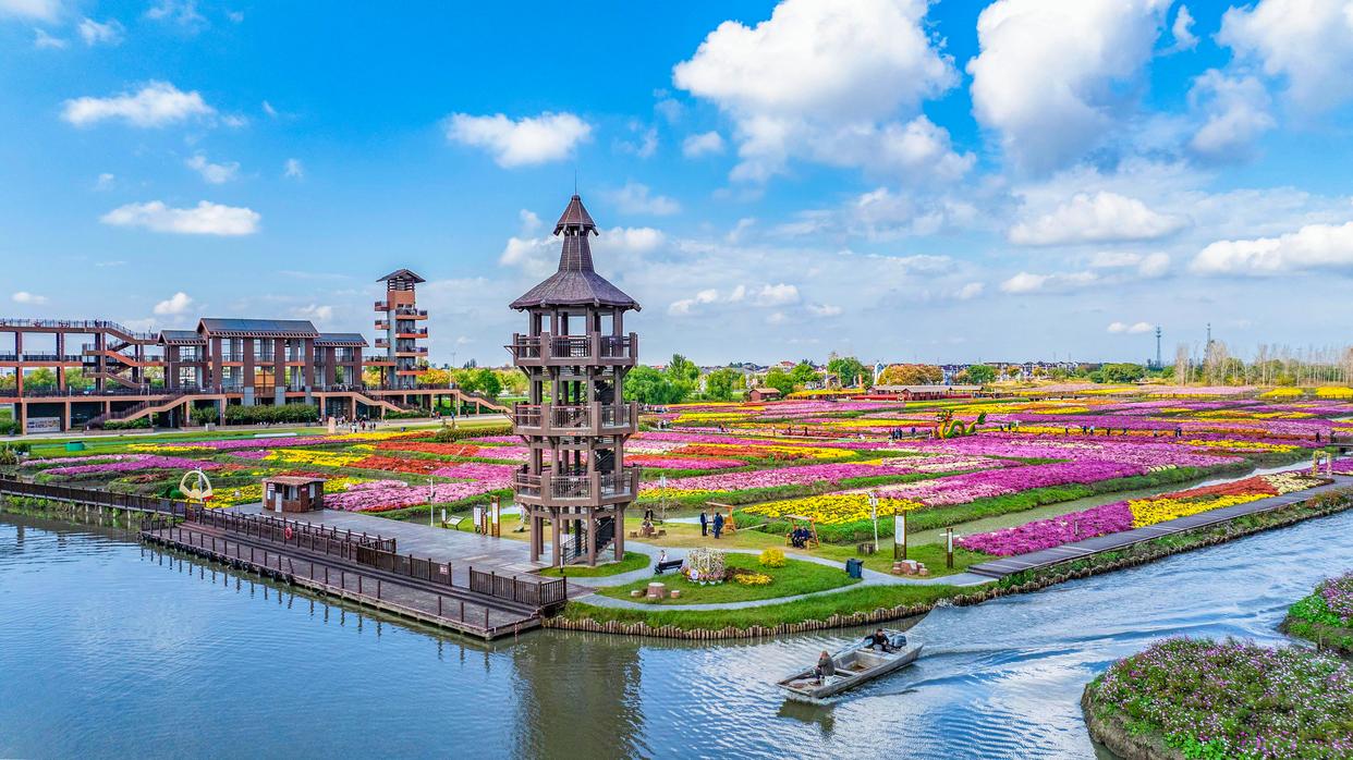 11月2日,游客在江苏省兴化市千垛景区赏菊游玩(无人机照片)。新华社发(周社根 摄)