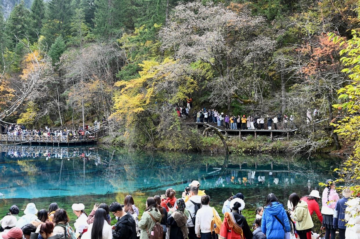 11月1日,在四川省阿坝藏族羌族自治州九寨沟县,游客在九寨沟风景区游玩。新华社发(兰自涛 摄)
