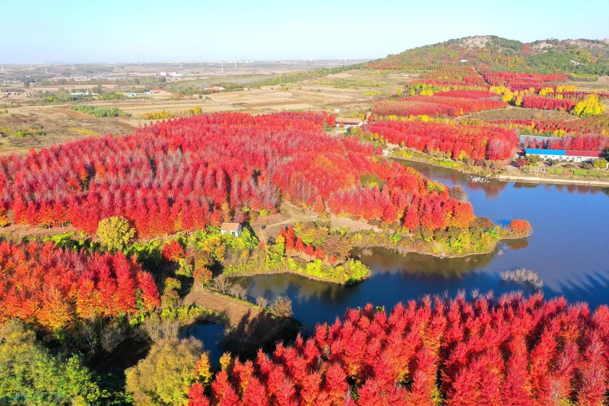 11月2日在山东省青岛市即墨区金口镇拍摄的枫树林(无人机照片)。新华社发(梁孝鹏 摄)