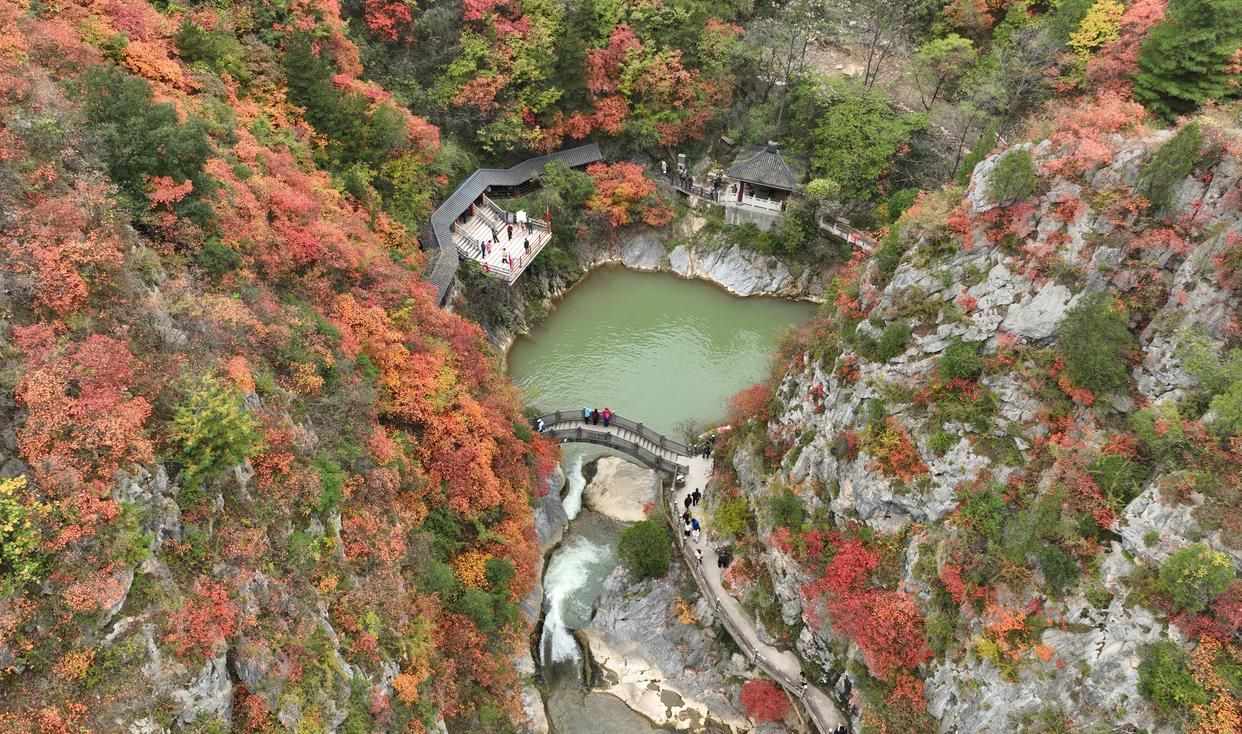 11月1日,游客在甘肃省陇南市成县西狭颂风景区欣赏秋日景色(无人机照片)。新华社发(冉创昌 摄)