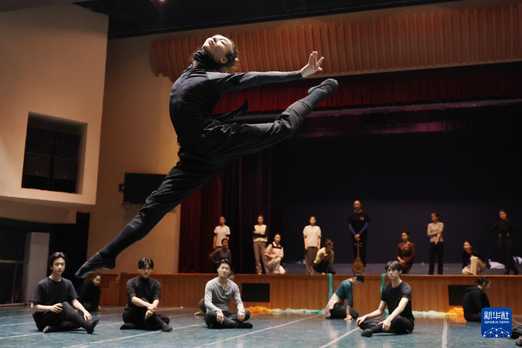 新版《丝路花雨》神笔张的扮演者罗志炜(前)在甘肃省歌舞剧院排练厅排练(11月3日摄)。新华社记者 陈斌 摄