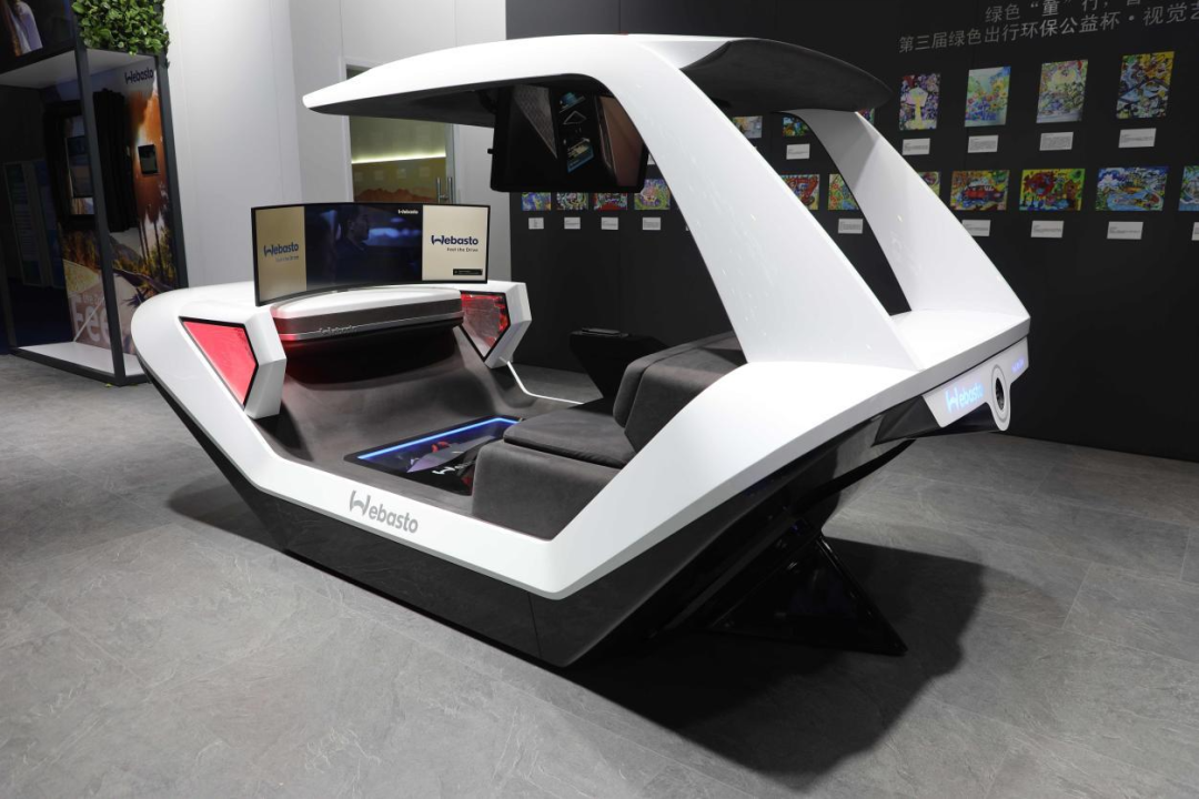 除了天上的,还有地下的。连续八年参展的伟巴斯特,今年带来了一款科技感十足的未来驾驶座舱。座舱不仅拥有大尺寸可开启软顶折叠天窗,还搭载了车顶影院系统。