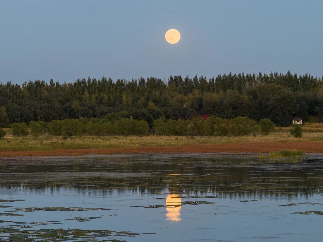 △2025年10月7日,辽宁沈阳,超级月亮现身康平县卧龙湖上空。