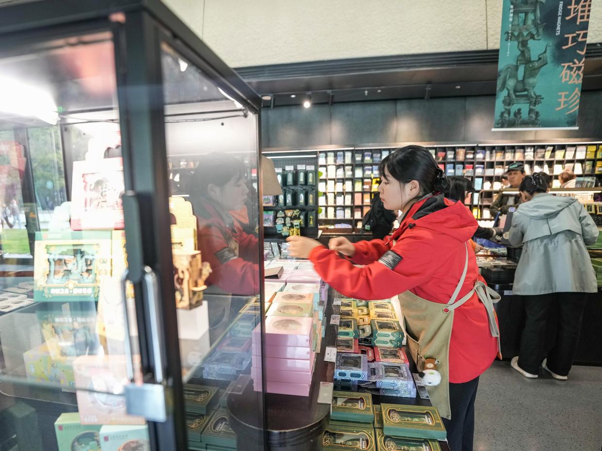 在四川省广汉市三星堆博物馆文创商店,工作人员往货架上补充文创产品(10月30日摄)。新华社记者 王曦 摄