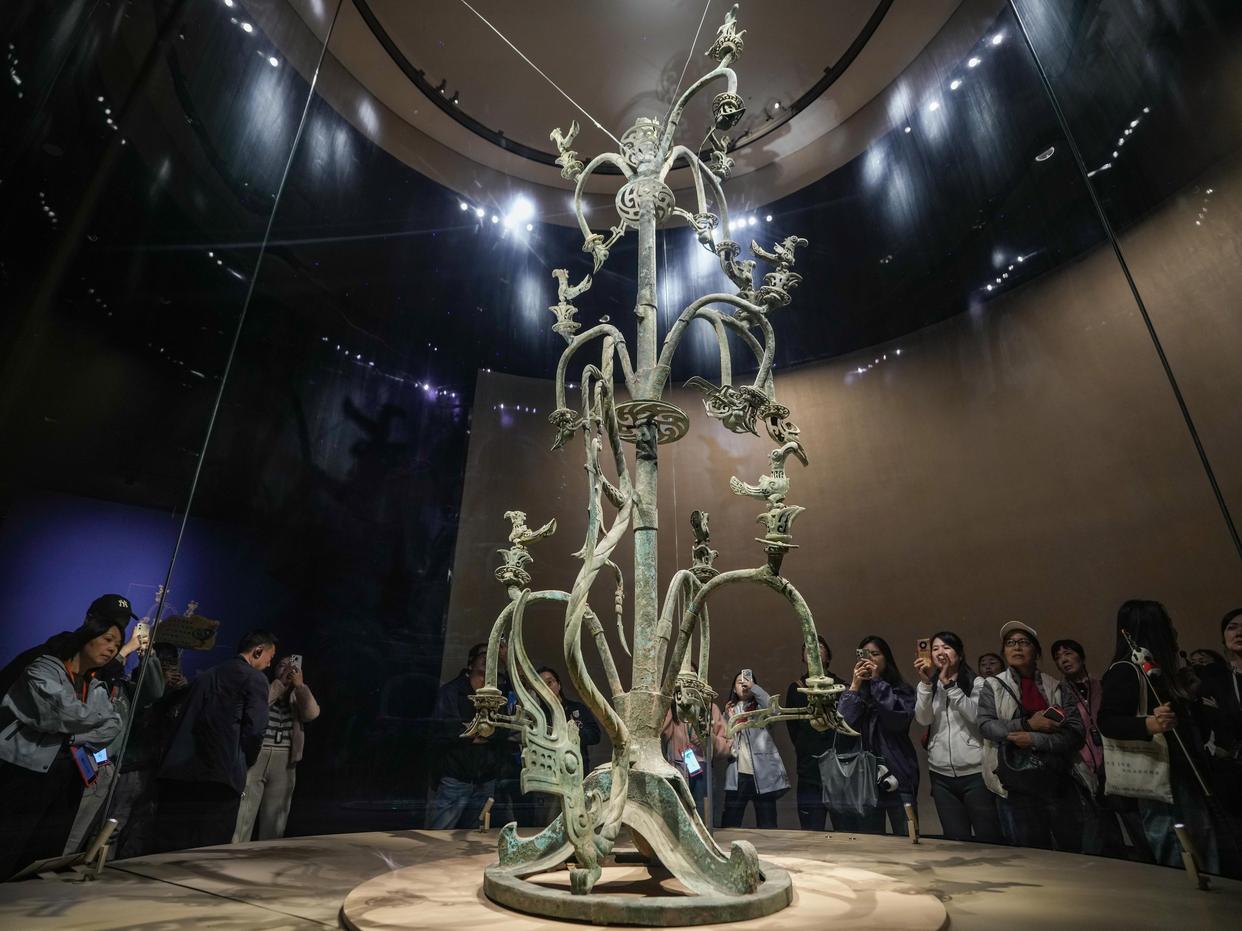游客在四川省广汉市三星堆博物馆参观青铜神树(10月30日摄)。新华社记者 王曦 摄