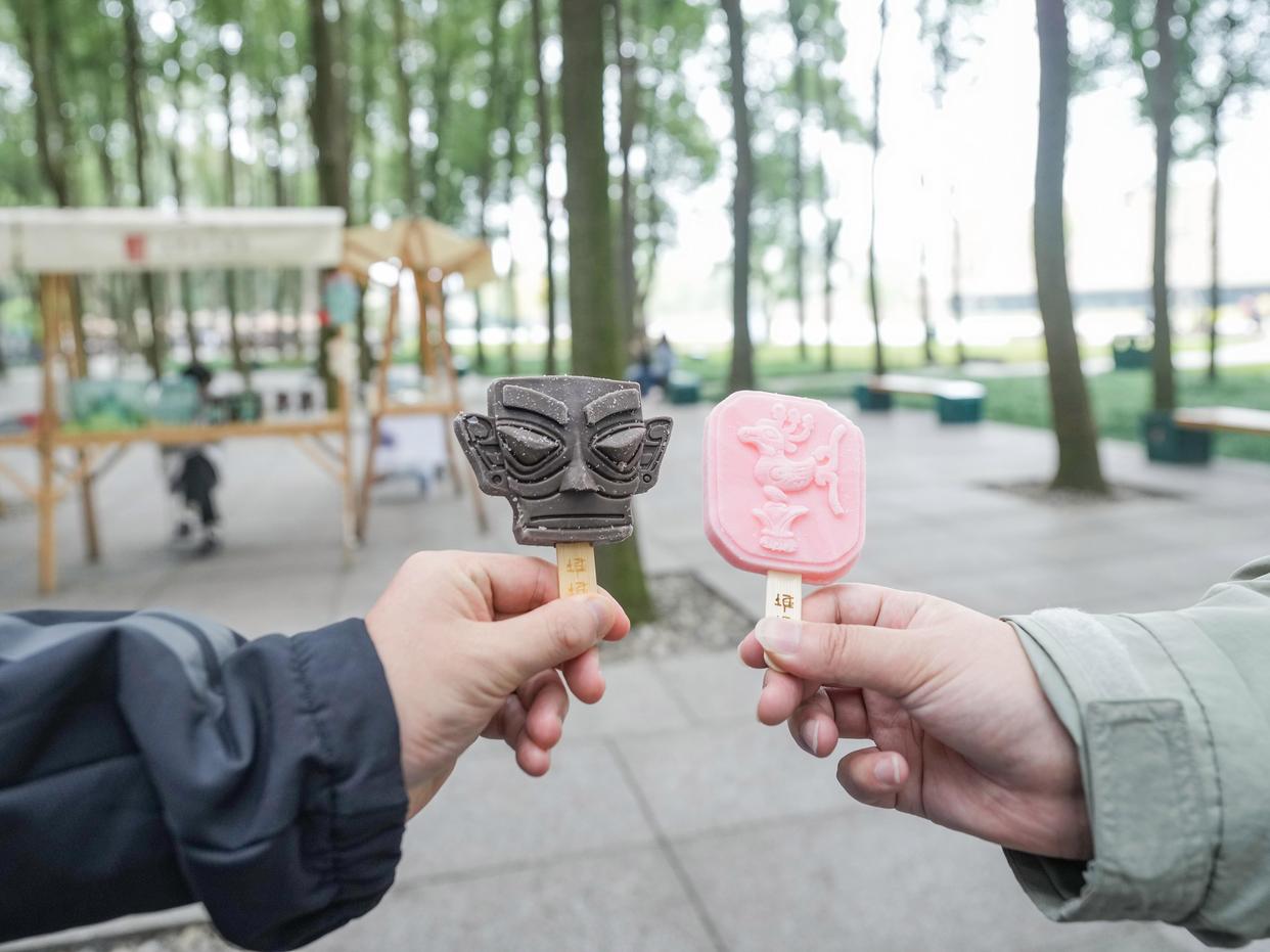 在四川省广汉市三星堆博物馆,两名游客在展示文创雪糕产品(10月30日摄)。新华社记者 王曦 摄