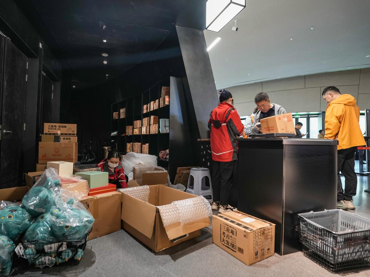 在四川省广汉市三星堆博物馆文创商店,现场快递点工作人员将游客选购的文创产品打包发货(10月30日摄)。新华社记者 王曦 摄