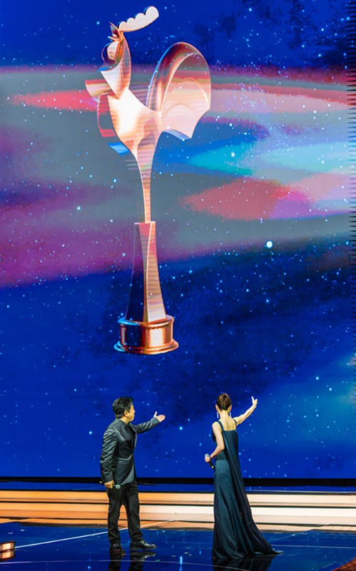 金鸡百花电影节开幕式上,流光与金鸡共舞。金鸡标识“破光而出”,这束光,似薪火相传的创作之火,照亮一代代电影人前行的足迹。
