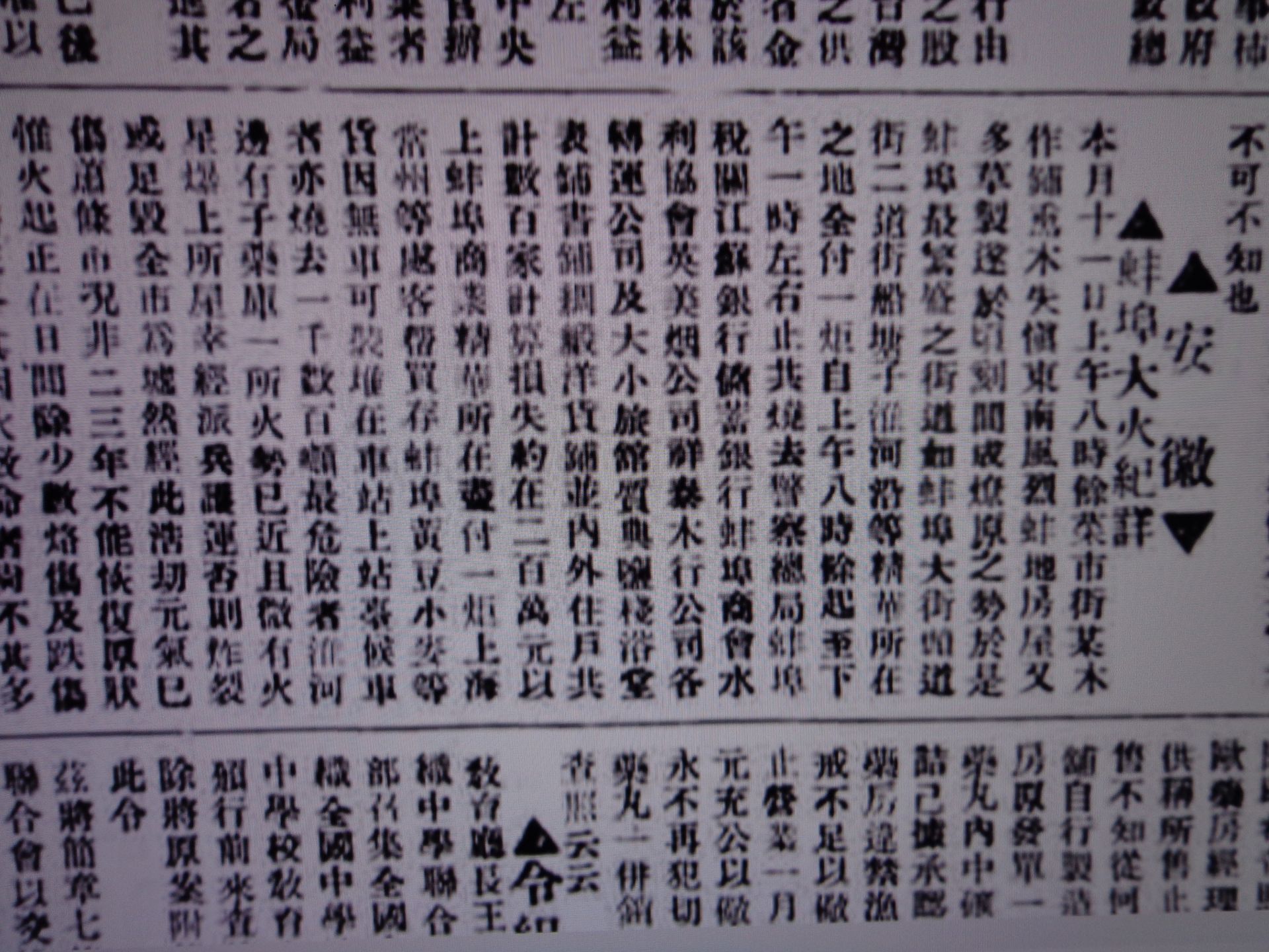1919年4月,地处皖北的蚌埠市区发生了重大火灾,给当地平民生命和公私财产带来了巨大损失,并引起当时全国舆论界,如上海《申报》《新闻报》《时事新报》、天津《大公报》等的普遍关注;由于这场大火发生的年份在民国八年(1919),所以被时人称之为“民八大火”。时隔78年后,此次重大火灾的简要经过,也被载入由中国社会科学院近代史研究所编撰的史学巨著《中华民国大事记》(李新总编,中国文史出版社1997年版)。本文主要依据当时新闻报道和档案资料,探析民八大火发生的经过及其对当地影响。