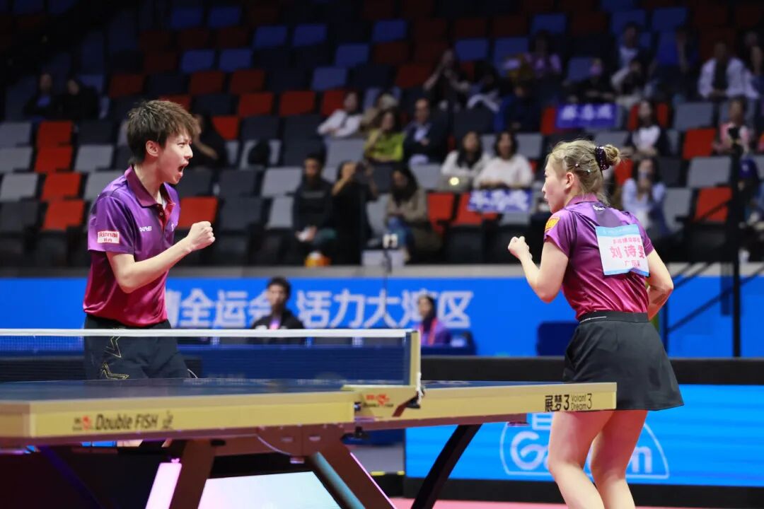 11月14日,第十五届全国运动会乒乓球混合双打决赛上的林高远和刘诗雯。