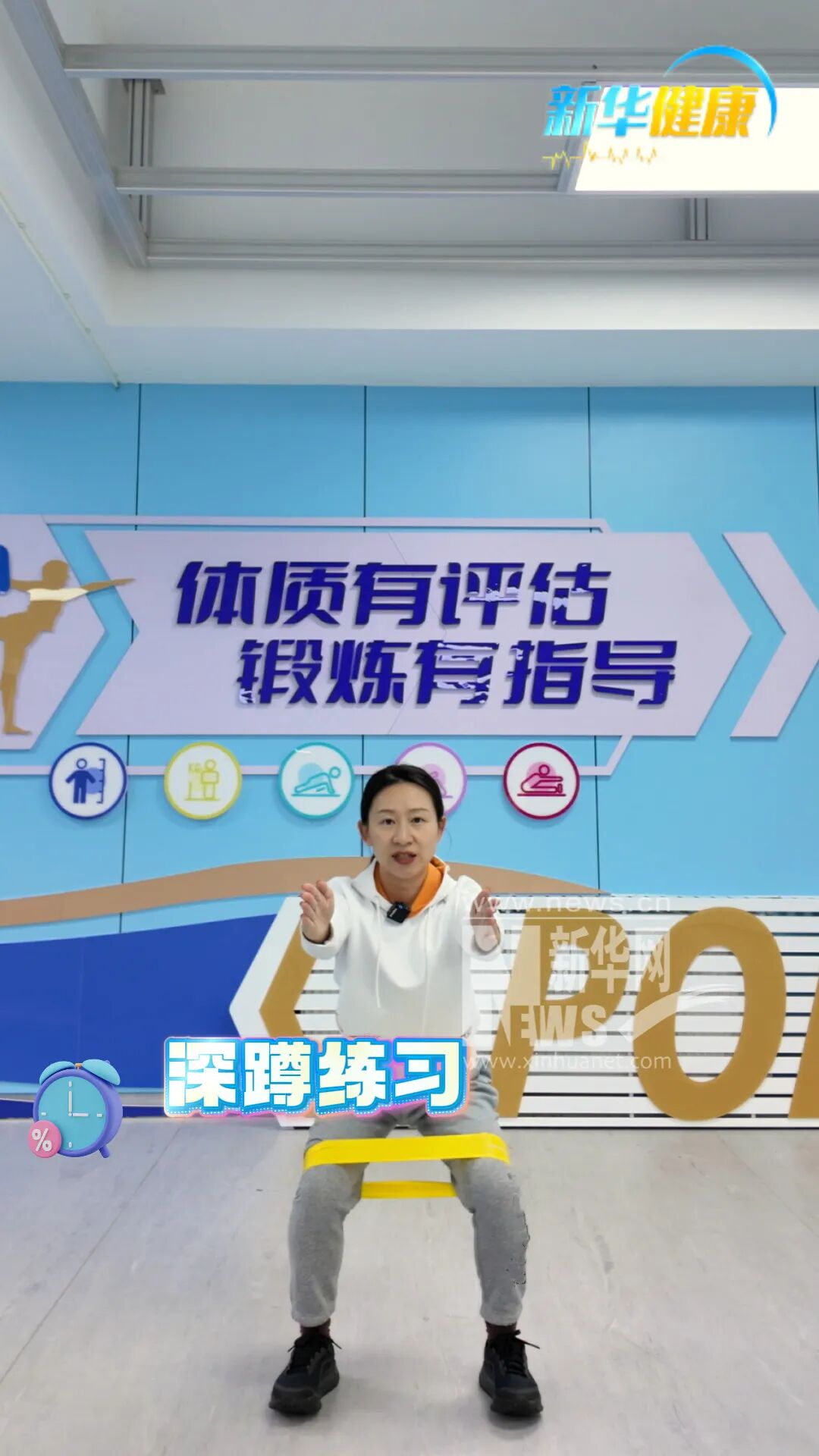 深蹲:将弹力绳置于膝关节上方,双脚与肩同宽,下蹲至大腿与小腿成直角为一组,每组完成8-12次。